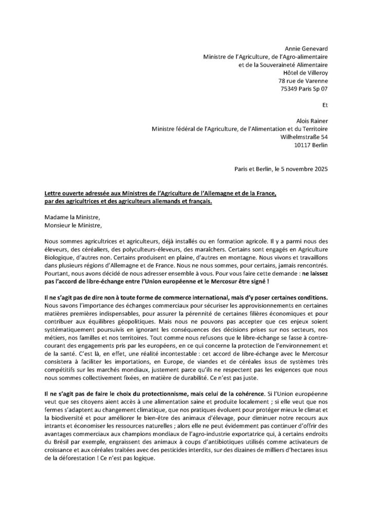 Lettre ouverte adressée aux Ministres de l’Agriculture de l’Allemagne et de la France,